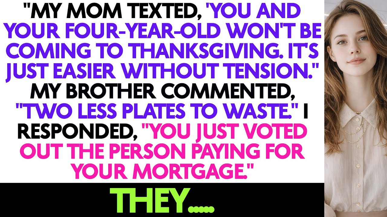 "My Mom Texted, 'You And Your Four-Year-Old Won't Be Coming To Thanksgiving. It's... "My Mom Texted, 'You And Your Four-Year-Old Won't Be Coming To Thanksgiving. It's Just Easier Without Tension." My Brother Commented, "Two Less Plates To Waste." I Responded, "You Just Voted Out The Person Paying For Your Mortgage." They..... #FamilyBetrayal #RevengeHeld #RevengeStories #SisterRevenge If this story stirred something in you—rage, relief, or that quiet thrill of justice served—tell me in the comments. Your thoughts breathe life into this space. For more revenge stories, broken trust, and the art of rising after betrayal, explore the playlists below—where karma doesn’t miss, and neither do the lessons. 🔹 Subscribe for more tales of reckoning. 👍 Like if you felt that satisfaction deep in your soul. Because sometimes, the best revenge isn’t loud—it’s simply becoming untouchable.